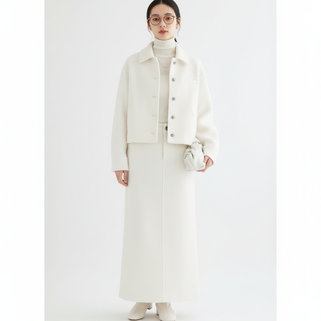Classic Brown Wool Two-Piece Set – Cropped Jacket & A-Line Maxi Skirt