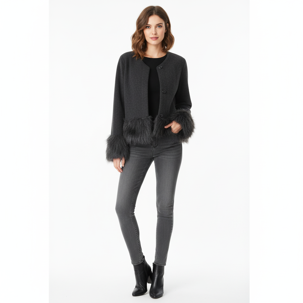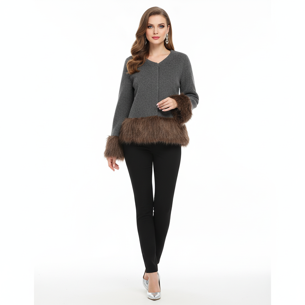 The standout feature of this sweater is its rich faux fur trim, placed along the hemline and sleeve cuffs. The contrast of the deep brown faux fur against the charcoal-grey knit creates a luxurious, fashion-forward look that instantly elevates any outfit. The fur-accented cuffs give the sweater a chic, high-end feel—perfect for those who love statement winter fashion.